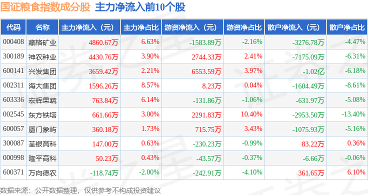 资金流向方面,国证粮食(399365)指数成份股当日主力资金净流出合计10.67亿元,游资资金净流入合计4.74亿元,散户资金净流入合计5.92亿元。成份股资金流向详情见下表: