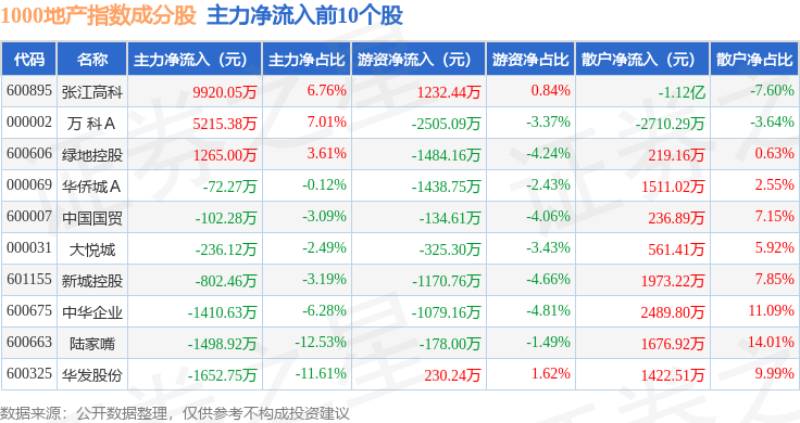 资金流向方面,1000地产(399367)指数成份股当日主力资金净流出合计2.24亿元,游资资金净流出合计8921.22万元,散户资金净流入合计3.14亿元。成份股资金流向详情见下表: