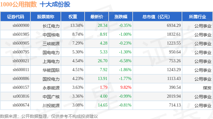 证券之星消息,11月14日,1000公用(399390)指数报收于2754.57点,跌0.72%,成交219.84亿元,换手率1.32%。当日该指数成份股中,上涨的有8家,永泰能源以9.82%的涨幅领涨,下跌的有35家,上海电力以6.58%的跌幅领跌。