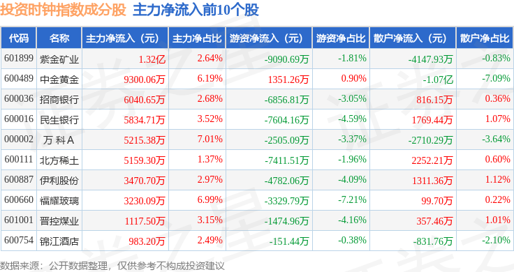 资金流向方面,投资时钟(399391)指数成份股当日主力资金净流出合计44.74亿元,游资资金净流入合计12.08亿元,散户资金净流入合计32.66亿元。成份股资金流向详情见下表: