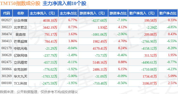 资金流向方面,TMT50(399610)指数成份股当日主力资金净流出合计113.12亿元,游资资金净流入合计42.38亿元,散户资金净流入合计70.74亿元。成份股资金流向详情见下表: