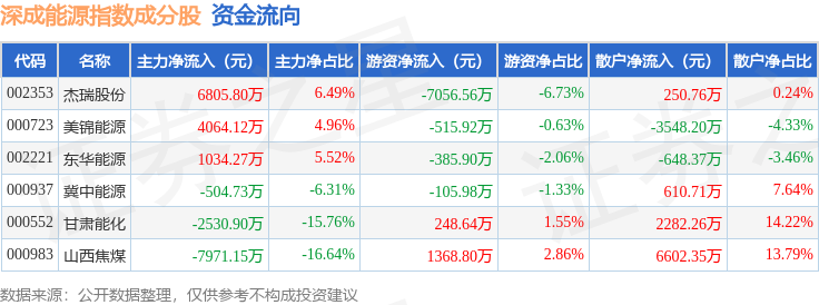 资金流向方面,深成能源(399680)指数成份股当日主力资金净流入合计897.41万元,游资资金净流出合计6446.92万元,散户资金净流入合计5549.51万元。成份股资金流向详情见下表: