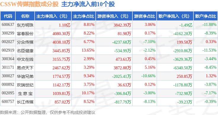 资金流向方面,CSSW传媒(399810)指数成份股当日主力资金净流出合计28.15亿元,游资资金净流入合计10.43亿元,散户资金净流入合计17.72亿元。成份股资金流向详情见下表: