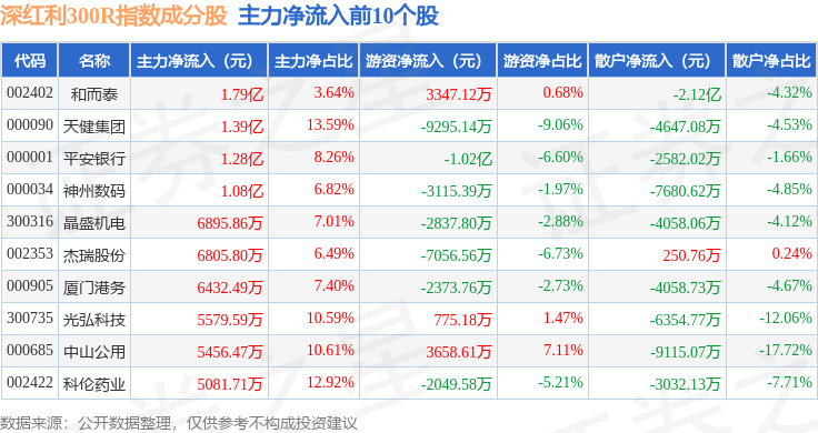 资金流向方面,深红利300R(470062)指数成份股当日主力资金净流出合计104.05亿元,游资资金净流入合计26.75亿元,散户资金净流入合计77.29亿元。成份股资金流向详情见下表: