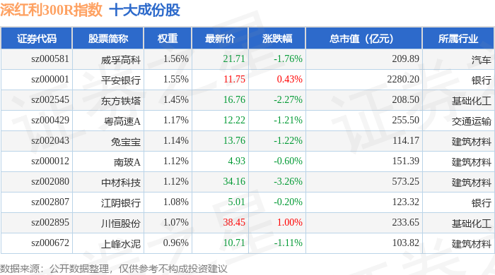 证券之星消息,11月14日,深红利300R(470062)指数报收于8297.89点,跌1.11%,成交1620.41亿元,换手率1.74%。当日该指数成份股中,上涨的有55家,杰瑞股份以8.21%的涨幅领涨,下跌的有232家,欢乐家以11.26%的跌幅领跌。