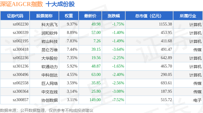 证券之星消息,11月14日,深证AIGCR(470075)指数报收于2589.31点,跌2.32%,成交302.17亿元,换手率1.73%。当日该指数成份股中,上涨的有2家,易华录以3.15%的涨幅领涨,下跌的有28家,协创数据以7.52%的跌幅领跌。