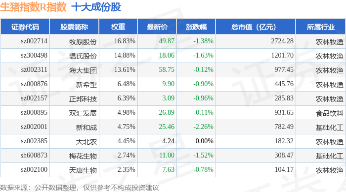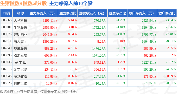 资金流向方面,生猪指数R(480073)指数成份股当日主力资金净流出合计3.13亿元,游资资金净流入合计2.12亿元,散户资金净流入合计1.01亿元。成份股资金流向详情见下表:
