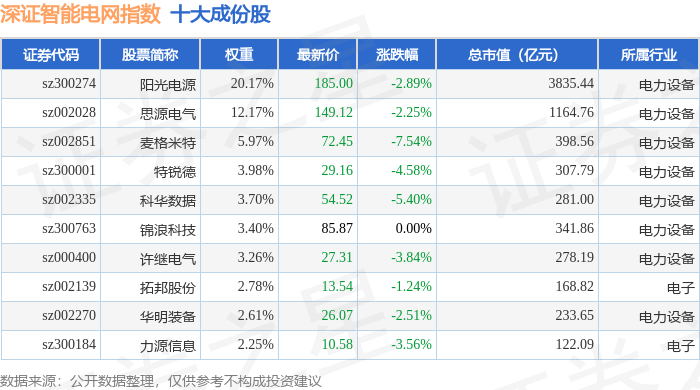 证券之星消息,11月14日,深证智能电网(970054)指数报收于4023.78点,跌2.75%,成交421.94亿元,换手率4.38%。当日该指数成份股中,上涨的有11家,上能电气以2.37%的涨幅领涨,下跌的有37家,麦格米特以7.54%的跌幅领跌。