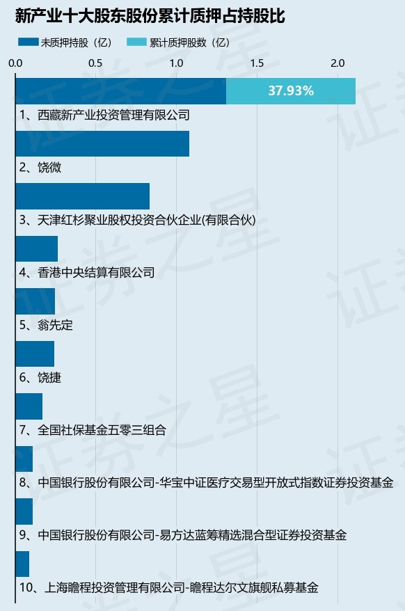 截止本公告日,股东西藏新产业投资管理有限公司已累计质押股份8010.0万股,占其持股总数的37.93%。本次质押后新产业十大股东的累计质押股份占持股比例(占持股比例的计算以公司最新一期财务报表公布的十大股东的持股总数为基准)见下图: