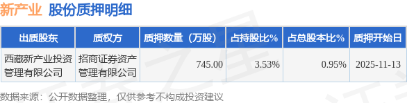 证券之星消息,新产业(300832)11月14日公开信息显示,股东西藏新产业投资管理有限公司向招商证券资产管理有限公司合计质押745.0万股,占总股本0.95%。质押详情见下表: