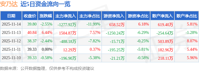 证券之星消息,截至2025年11月14日收盘,安乃达(603350)报收于39.8元,下跌2.55%,换手率6.07%,成交量2.67万手,成交额1.07亿元。