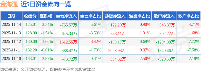 证券之星消息,截至2025年11月14日收盘,金海通(603061)报收于125.01元,下跌2.34%,换手率2.59%,成交量1.08万手,成交额1.37亿元。