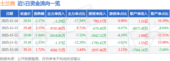 证券之星消息,截至2025年11月14日收盘,士兰微(600460)报收于28.81元,下跌2.27%,换手率1.54%,成交量25.6万手,成交额7.41亿元。