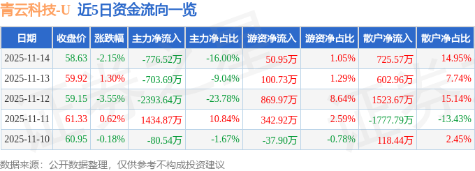 证券之星消息,截至2025年11月14日收盘,青云科技(688316)报收于58.63元,下跌2.15%,换手率1.71%,成交量8205.0手,成交额4853.9万元。