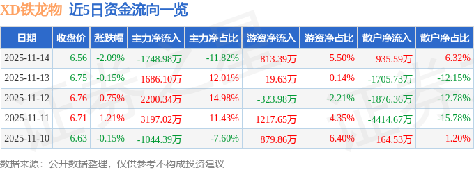 证券之星消息,截至2025年11月14日收盘,XD铁龙物(600125)报收于6.56元,下跌2.09%,换手率1.71%,成交量22.3万手,成交额1.48亿元。