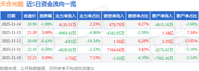 证券之星消息,截至2025年11月14日收盘,天合光能(688599)报收于20.9元,下跌1.88%,换手率3.81%,成交量83.1万手,成交额17.77亿元。