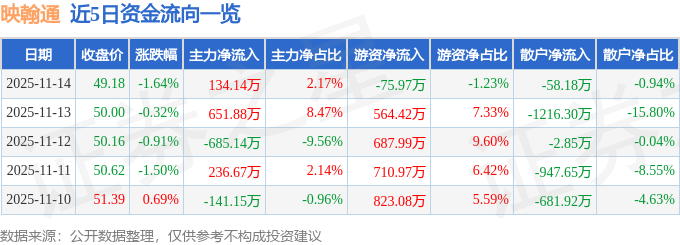 11月14日的资金流向数据方面,主力资金净流入134.14万元,占总成交额2.17%,游资资金净流出75.97万元,占总成交额1.23%,散户资金净流出58.18万元,占总成交额0.94%。