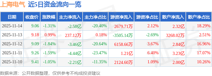11月14日的资金流向数据方面,主力资金净流出2.58亿元,占总成交额20.4%,游资资金净流入2679.71万元,占总成交额2.12%,散户资金净流入2.32亿元,占总成交额18.29%。