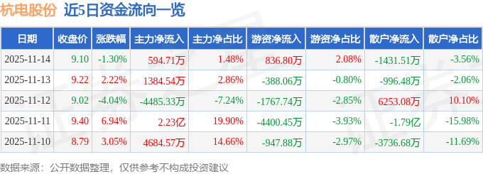 证券之星消息,截至2025年11月14日收盘,杭电股份(603618)报收于9.1元,下跌1.3%,换手率6.32%,成交量43.71万手,成交额4.02亿元。