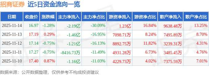 证券之星消息,截至2025年11月14日收盘,招商证券(600999)报收于16.97元,下跌1.28%,换手率0.57%,成交量42.6万手,成交额7.28亿元。