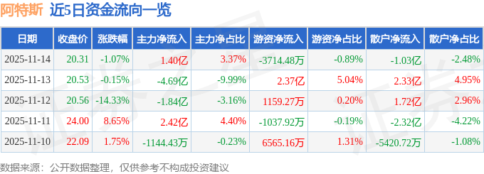 11月14日的资金流向数据方面,主力资金净流入1.4亿元,占总成交额3.37%,游资资金净流出3714.48万元,占总成交额0.89%,散户资金净流出1.03亿元,占总成交额2.48%。