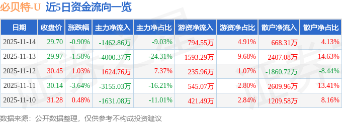 证券之星消息,截至2025年11月14日收盘,必贝特(688759)报收于29.7元,下跌0.9%,换手率11.66%,成交量5.42万手,成交额1.62亿元。