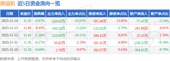证券之星消息,截至2025年11月14日收盘,美迪凯(688079)报收于11.35元,下跌0.87%,换手率0.67%,成交量2.67万手,成交额3045.12万元。