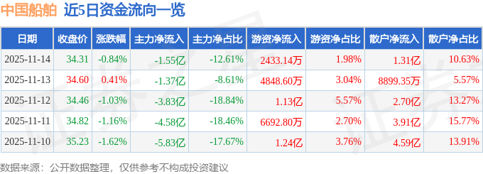 证券之星消息,截至2025年11月14日收盘,中国船舶(600150)报收于34.31元,下跌0.84%,换手率0.47%,成交量35.72万手,成交额12.3亿元。