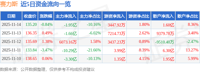 证券之星消息,截至2025年11月14日收盘,赛力斯(601127)报收于135.2元,下跌0.84%,换手率0.94%,成交量14.13万手,成交额19.16亿元。