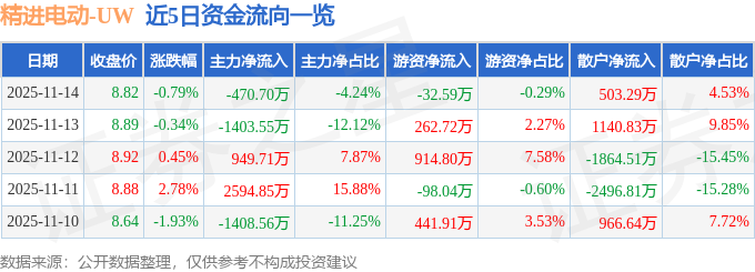 证券之星消息,截至2025年11月14日收盘,精进电动(688280)报收于8.82元,下跌0.79%,换手率2.4%,成交量12.47万手,成交额1.11亿元。