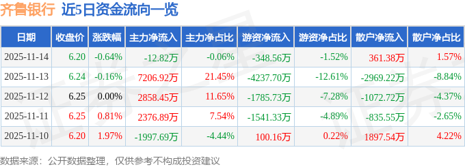 证券之星消息,截至2025年11月14日收盘,齐鲁银行(601665)报收于6.2元,下跌0.64%,换手率0.6%,成交量36.64万手,成交额2.3亿元。