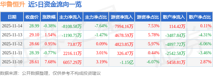 证券之星消息,截至2025年11月14日收盘,华鲁恒升(600426)报收于28.99元,下跌0.38%,换手率1.7%,成交量35.95万手,成交额10.61亿元。