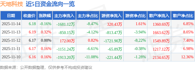 证券之星消息,截至2025年11月14日收盘,天地科技(600582)报收于6.18元,下跌0.16%,换手率0.77%,成交量32.06万手,成交额1.99亿元。