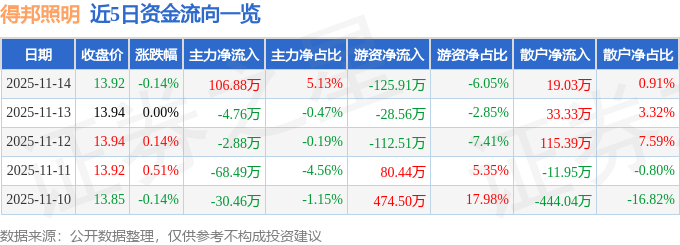 证券之星消息,截至2025年11月14日收盘,得邦照明(603303)报收于13.92元,下跌0.14%,换手率0.31%,成交量1.49万手,成交额2081.79万元。