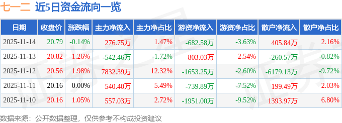 证券之星消息,截至2025年11月14日收盘,七一二(603712)报收于20.79元,下跌0.14%,换手率1.17%,成交量9.03万手,成交额1.88亿元。
