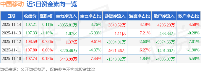 证券之星消息,截至2025年11月14日收盘,中国移动(600941)报收于107.21元,下跌0.11%,换手率0.95%,成交量8.54万手,成交额9.19亿元。
