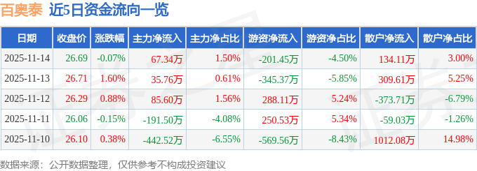 证券之星消息,截至2025年11月14日收盘,百奥泰(688177)报收于26.69元,下跌0.07%,换手率0.4%,成交量1.67万手,成交额4476.83万元。