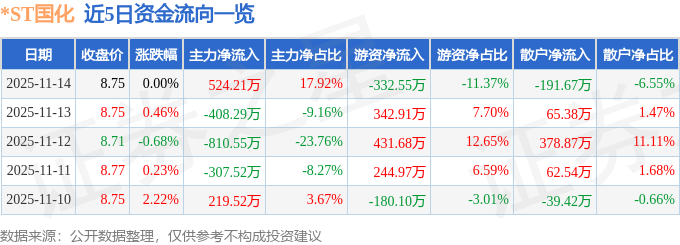 证券之星消息,截至2025年11月14日收盘,*ST国化(600636)报收于8.75元,上涨0.0%,换手率0.76%,成交量3.34万手,成交额2924.96万元。