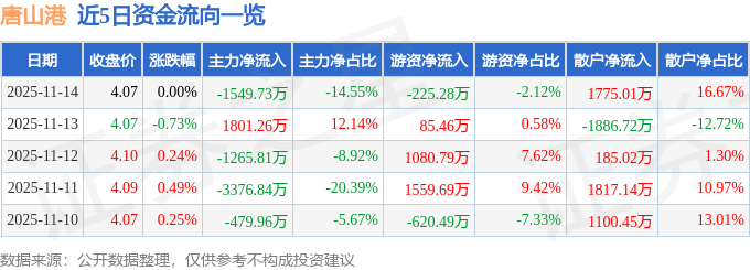 证券之星消息,截至2025年11月14日收盘,唐山港(601000)报收于4.07元,上涨0.0%,换手率0.44%,成交量26.05万手,成交额1.07亿元。