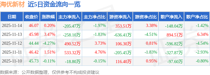 证券之星消息,截至2025年11月14日收盘,海优新材(688680)报收于46.07元,上涨0.2%,换手率2.67%,成交量2.24万手,成交额1.04亿元。