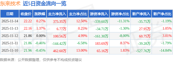 证券之星消息,截至2025年11月14日收盘,东来技术(688129)报收于22.22元,上涨0.27%,换手率1.12%,成交量1.35万手,成交额3002.5万元。