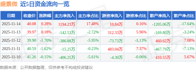 11月14日的资金流向数据方面,主力资金净流入1194.23万元,占总成交额17.48%,游资资金净流入10.84万元,占总成交额0.16%,散户资金净流出1205.06万元,占总成交额17.64%。