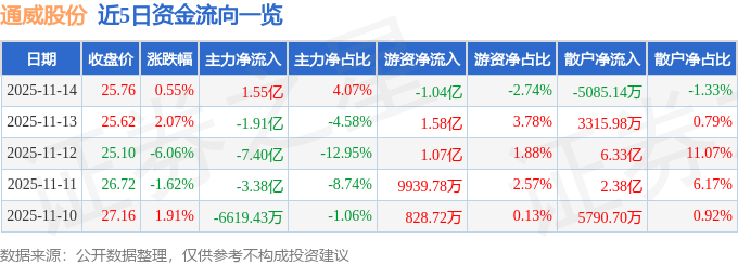 证券之星消息,截至2025年11月14日收盘,通威股份(600438)报收于25.76元,上涨0.55%,换手率3.26%,成交量146.81万手,成交额38.16亿元。