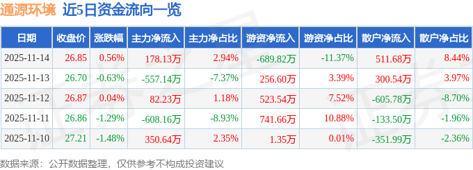 证券之星消息,截至2025年11月14日收盘,通源环境(688679)报收于26.85元,上涨0.56%,换手率1.73%,成交量2.27万手,成交额6064.7万元。