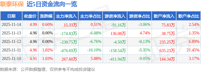 证券之星消息,截至2025年11月14日收盘,联泰环保(603797)报收于4.99元,上涨0.6%,换手率1.03%,成交量5.95万手,成交额2982.41万元。