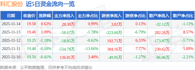 证券之星消息,截至2025年11月14日收盘,科汇股份(688681)报收于19.58元,上涨0.62%,换手率1.39%,成交量1.45万手,成交额2846.77万元。