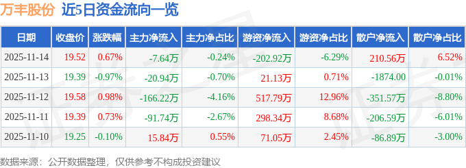 证券之星消息,截至2025年11月14日收盘,万丰股份(603172)报收于19.52元,上涨0.67%,换手率3.3%,成交量1.65万手,成交额3227.46万元。