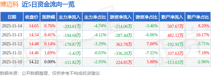 11月14日的资金流向数据方面,主力资金净流出293.61万元,占总成交额4.74%,游资资金净流出214.06万元,占总成交额3.46%,散户资金净流入507.67万元,占总成交额8.2%。