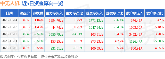 证券之星消息,截至2025年11月14日收盘,中无人机(688297)报收于46.6元,上涨1.04%,换手率0.84%,成交量5.65万手,成交额2.65亿元。