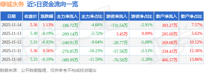 证券之星消息,截至2025年11月14日收盘,绿城水务(601368)报收于5.36元,上涨1.13%,换手率0.85%,成交量7.48万手,成交额4006.77万元。